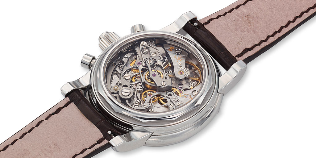 For the ref. 5004, Patek Philippe’s engineers undertook the additional challenge of adding a split-seconds function (“rattrapante” in French), which allows the timing of two separate events that start simultaneously, such as two runners in a race. The new movement was named CHR 27-70 Q, with the R denoting Rattrapante.