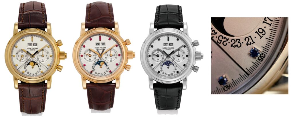 Four pieces gem-set ref. 5004. Image credit: Christie’s (watches), @horology_ancienne (white gold and blue sapphire detail)