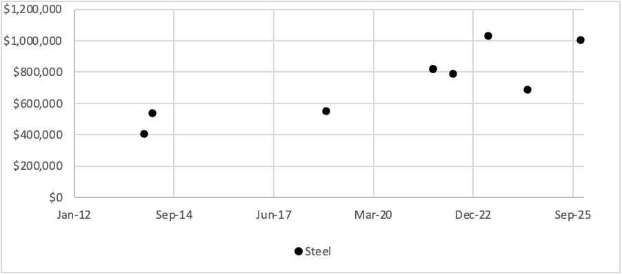The steel model has appeared ten times at auction across major houses, representing eight unique examples. It commands a significant premium compared to regular precious metal models and sells in similar price ranges to notable special orders, with two of the last three sales exceeding $1 million.