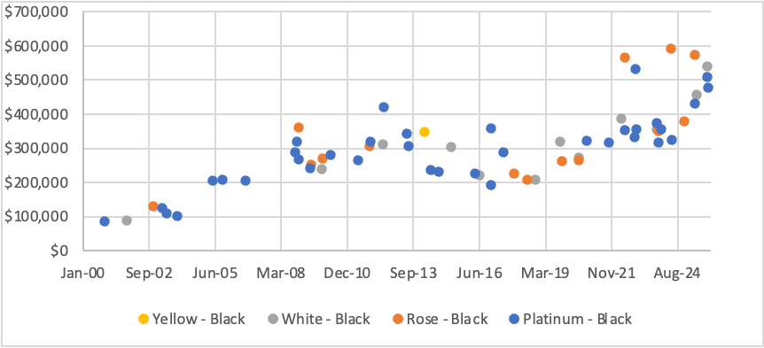 Sixty-four watches with black dials have been sold across major auction houses. It is assumed that their total production is approximately half the production of watches with silver dials. Due to their relative rarity compared to their silver-dial counterparts, watches with black dials command a premium. In contrast, the rarer white- and rose-gold examples sell for more than platinum pieces. The last three-year average was $398,000 for platinum ($472,000 for 2025), $428,000 for white gold ($498,000 for 2025), and $473,000 for rose gold ($574,000 for 2025).