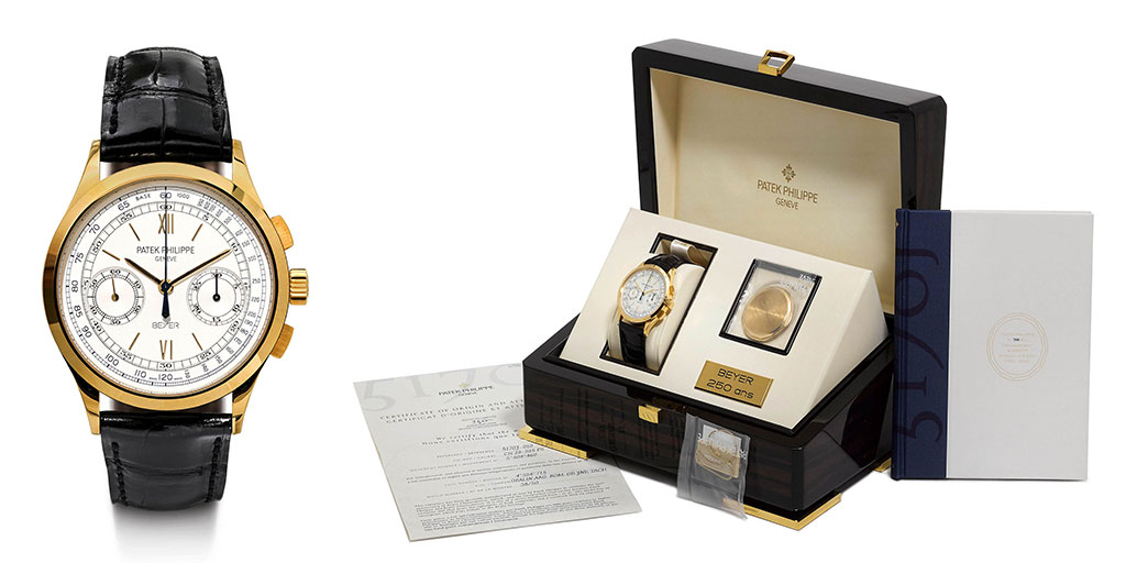 To mark this historic moment and Beyer’s quarter millennium of existence, Patek Philippe released a 50-piece limited edition of ref. 5170 in yellow gold (ref. 5170J-010) as a pre-series to the regular production. The Beyer edition features a blue tachymeter scale (as opposed to a pulsometer on the first series regular production models), blue chronograph seconds and minutes hands (as opposed to black) and the “BEYER” signature at 6 o’clock. The watch came with a sapphire case back and a second closed case back that is engraved “Patek Philippe No [series number]/50 FabriquĂ©e pour le 250ème de Beyer Ă ZĂĽrich 1760 – 2010″. Its accompanying box features a plaque that reads “BEYER 250 ans” and a slot to insert the second case back.