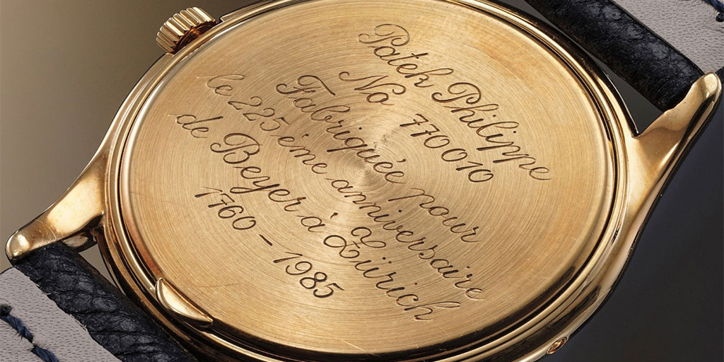 - A hand-engraved solid caseback that reads “Patek Philippe – No [movement number] – Fabriquée pour le 225ème anniversaire de Beyer à Zürich – 1760-1985”
