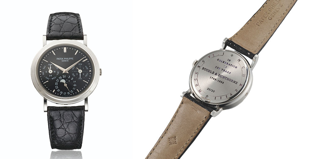 Creating an exclusive series of 20 perpetual calendars was daring back in 1998 as these complicated pieces were not quite an easy sale. The occasion was obviously very special: commemorating two centuries of the foundation of British jeweler Boodle & Dunthorne (now named Boodles). The resulting piece (ref. 5049P-001) is made of platinum with a black dial and dauphine hands. It is based on the ref. 5139 but with a stepped bezel as opposed to a Clous de Paris pattern. The case back reads “In celebration of 200 years Boodle & Dunthorne – 1798 – 1998” and the number xx/20. Today this model is highly desirable and sought after among collectors as it’s one of only a handful of limited and numbered perpetual calendars.