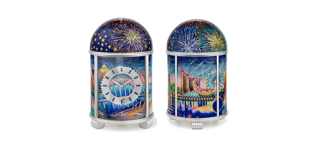 On the occasion of Singapore-based retailer Cortina’s golden jubilee in 2022, a unique Dome Clock dedicated to the city of Singapore and its skyline was created. Crafted in grand feu cloisonnĂ© enamel, the ref. 20145M-001 depicts iconic local landmarks from the Merlion to the Central Business District, the Esplanade and across to Marina Bay Sands. On the dome, a cascade of fireworks with 50 gold stars celebrates the anniversary of Cortina Watch, while the base is engraved “Cortina Watch – 50th anniversary – Since 1972”. This piece has not been offered for sale and has joined Cortina’s own collection.