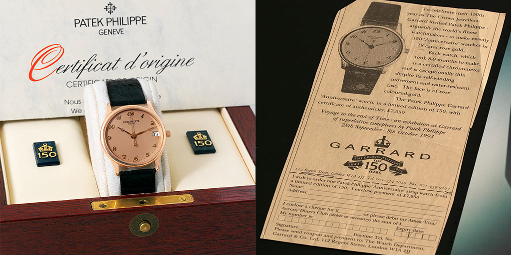 To commemorate the 150th anniversary of long-term, London-based Patek Philippe retailer Garrard & Co. in 1993, Patek Philippe created a limited edition of 150 3998S. A sought after “pink-on-pink” with pink gold case and pink dial (described as “velouté rose”), this edition is made even more special by the addition of pink gold Breguet numerals and hands. The watch came with a sapphire crystal – a rare feature at the time – that has been personalized with “1843 GARRARD 1993 L’ANNIVERSAIRE” and xxx/150. Presented with a unique wooden box, it initially retailed for £7,950 as can be seen on the newspaper clipping above.