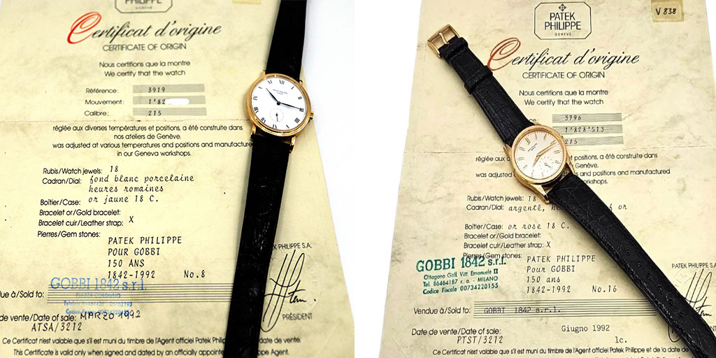Gobbi, the historic watch and jewelry retailer founded in 1842 by Raimondo Gobbi based in Milan, Italy, had been family-run for six generations until its closure in the summer of 2024. The relationship with Patek Philippe could be traced back as early as the 1940s. Celebrating their 150th anniversary in 1992, Patek Philippe and Gobbi created two commemorative editions of ref. 3796 in rose gold and ref. 3919 in yellow gold– two classic watches reflecting the taste of the time. While the watches themselves are identical to the regular production models, they carry a special hand engraving on the back: “Patek Philippe pour Gobbi 150 ans 1842-1992” followed by the number of the edition. Notably the Certificate of Origin delivered with the watches also mentions the engraving. The presence of the original certificate obviously adds a lot to the collectability of these commemorative pieces.