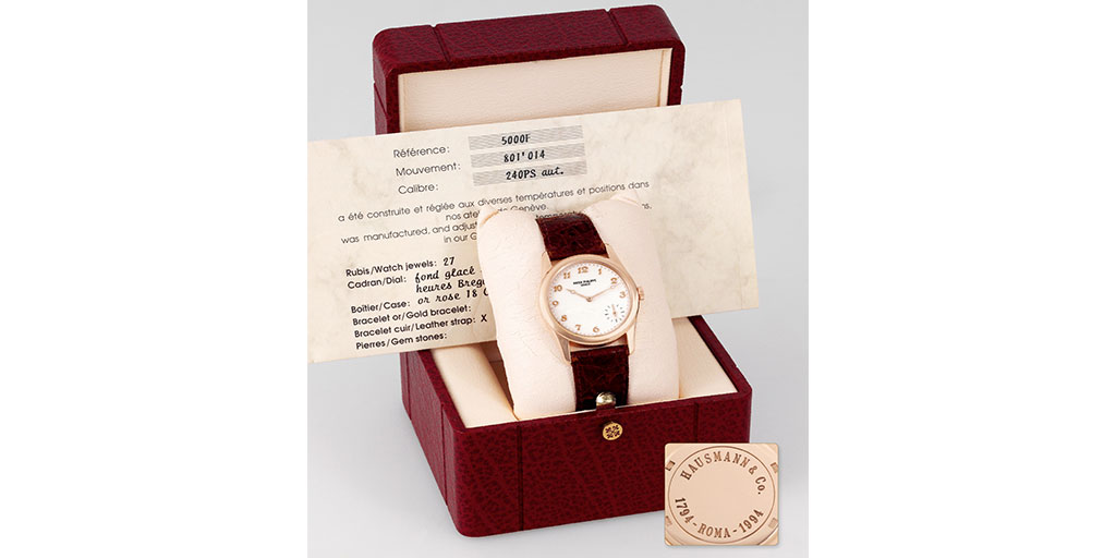 Founded in 1794 by German emigrant Ernst Hausmann, Hausmann & Co. has been one of the most important Italian watch and jewelry retailers and remains family-owned and operated by descendants of the founding families to this day. To celebrate their 200th anniversary in 1994, Patek Philippe released a special edition of 100 examples of ref. 5000F in pink gold with a silver dial with Breguet numerals and hands. The plain case back is engraved “1794 – Roma – 1994 Hausmann & Co.”. Anecdotally, the ref. 5000 was initially designed for a possible partnership between Patek Philippe and Ferrari that never materialized. This Italian origin story might have influenced the choice of this model for the anniversary.