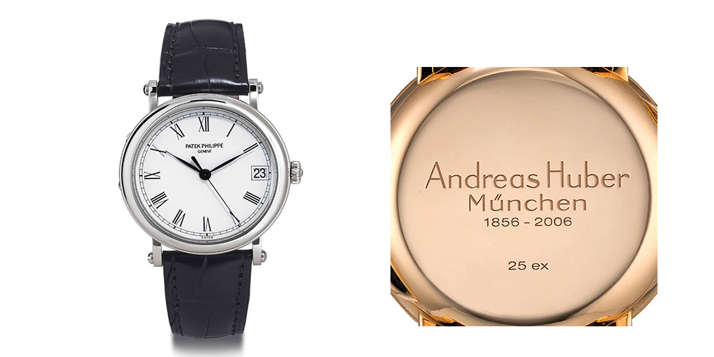 Based in Munich, Germany, Andreas Huber was founded in 1856 and was the oldest watch and jewelry retailer in Germany. It was family-owned until 2002 when it was acquired by Bucherer but kept the “Andreas Huber” name until 2009. To celebrate their 150th anniversary in 2006, two special editions of ref. 5053 were made in pink (ref. 5053R-010) and white gold (ref. 5053G-010) in 25 pieces each. Contrary to the regular model, the date is at 3 o’clock (and not 6), the silver dial features traditional Roman numerals, and the officer style-case back is engraved “Andreas Huber München – 1856-2006 – 25 ex”. The ref. ref. 5053 was only produced between 2001 and 2005 so this limited edition can once again be considered an end-of-run piece.