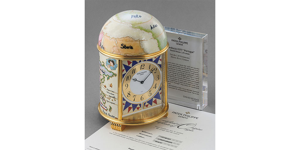 To celebrate the 25 years of David Rosas in Lisbon, Portugal, Patek Philippe’s artisans created a Dome Clock (ref. 1577M-001) celebrating the great discoveries of Portugal, each panel displaying an ancient map that depicts Portuguese territories at the time of the signing of the Treaty of Tordesillas in 1494. The base of the clock is engraved “Portugal Peça Ăšnica, 25° Aniversário da David Rosas”. In a very generous gesture, the piece was auctioned off for charity by David Rosas in February 2010 and the €105,000 proceeds donated to “Terra dos Sonhos”.