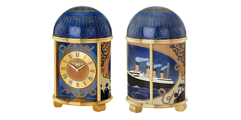 Created for the 60th anniversary of Belfast-based Lunn’s Jewellers in 2014, this clock’s central motif recalls the departure of the RMS Titanic from Belfast for its maiden voyage in 1912. The cloisonné enamel dome is inspired by the Titanic’s glass cupola. Since 2015, it is on loan at the City Hall of Belfast, which had recently opened, and is on display along other Titanic artifacts.