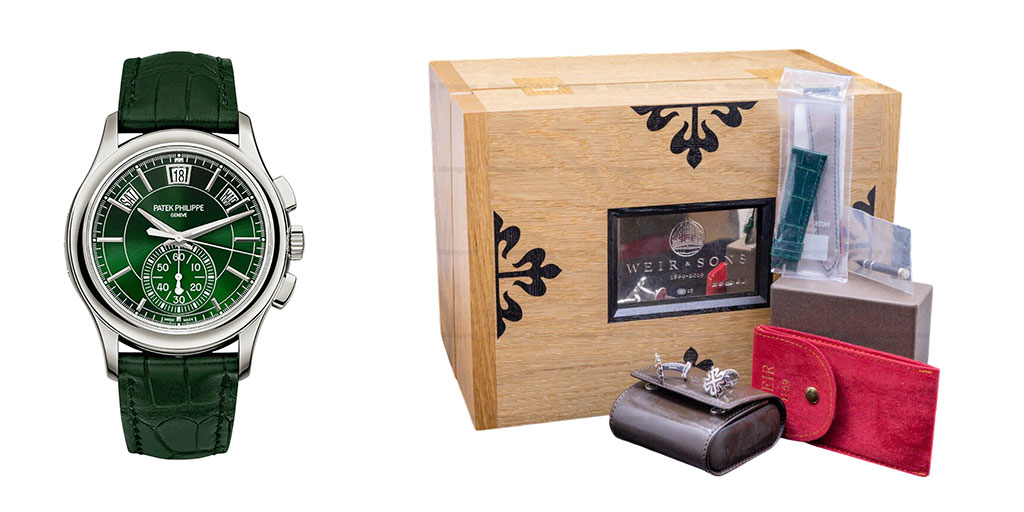 Weir and Sons is a family jeweler, now run by fourth- and fifth-generation family members based in Dublin, Ireland. For their 150th anniversary in 2019, 25 pieces of the special edition ref. 5905 in platinum were commissioned (5905P-014). The Annual Calendar chronograph is characterized by the “Kelly green”, also called “Irish green”, color of the dial and strap—a color synonymous with Irish tradition and heritage. The case back is engraved with “Weir and Sons 150th Anniversary”, and the watch was delivered with a pair of cufflinks. Additionally, Weir and Sons commissioned an oak wood outer box made by Croglin Limited (in place of the standard Patek Philippe presentation box) which features a commemorative plaque on which the limited-edition number is engraved.