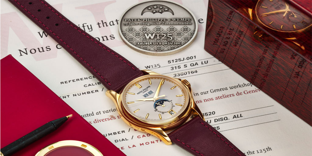 The 36mm case of the ref. 5125 – note the “125” as a nod to the anniversary – houses an Annual Calendar movement with the same type of display as the ref. 5396. The yellow, rose and white gold versions – each limited to 125 pieces – feature an opaline dial, while the platinum – limited to 100 pieces – features a black dial with a red minute track, a color scheme many collectors chose to commission their own special orders. The calendars were available in either German or English, all variants feature “WEMPE” under the moon phase at 6 o’clock and the case back reads “125 Jahre Wempe xxx/125 Patek Philippe” (Platinum: xxx/100). Here again the presence of a complete set adds to the value of the watch: it came with an additional sapphire case back, a commemorative medal and a red outer packaging embossed with “W125”.