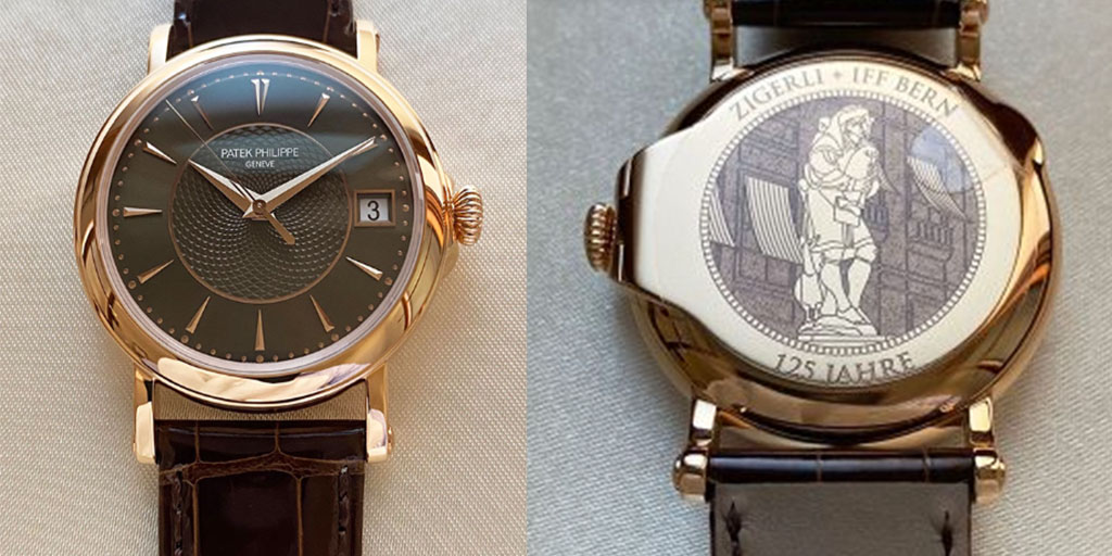 In celebration of their 125th anniversary and 115 years of collaboration with Patek Philippe, the oldest luxury boutique in the Swiss capital Bern, Zigerli & Iff commissioned 25 specially made ref. 5153R-010 timepieces in rose gold in 2018. The dial features a rich brown finish, while the officer-style case back is engraved with the representation of a bagpiper in medieval attire—inspired by the statue atop the iconic Pfeiferbrunnen fountain in Bern’s old town—along with the inscriptions “ZIGERLI + IFF ” and “125 JAHRE”.