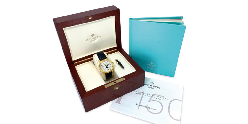 The ref. 5150, also known as “T150”, was made in a total of 450 pieces: 150 in yellow, rose and white gold. The hinged case back is engraved with an image of Patek Philippe’s historic Geneva headquarters and the dates 1851 and 2001. The edition was made even more special by its full set, which includes an anniversary medal and a unique Tiffany-blue outer packaging embossed with “T150” showing how much care was given in creating this special piece. A full set obviously adds a lot to the collectability of this unique reference.