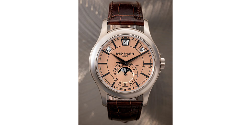 Nestled in Montreux on the Swiss Riviera, historic family retailer Roman Mayer celebrated its 130th anniversary and 75 years of collaboration with Patek Philippe in 2018. For the occasion, the retailer released the remarkable 15-piece limited edition ref. 5205G-016. The Annual Calendar features a white gold case and a salmon dial with blacked indices and hands—a highly sought-after combination among Patek Philippe collectors. Notably, the calendar indications are in French, as Montreux is in the French-speaking part of Switzerland.