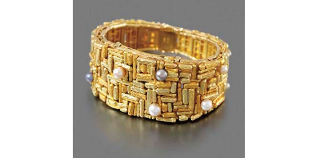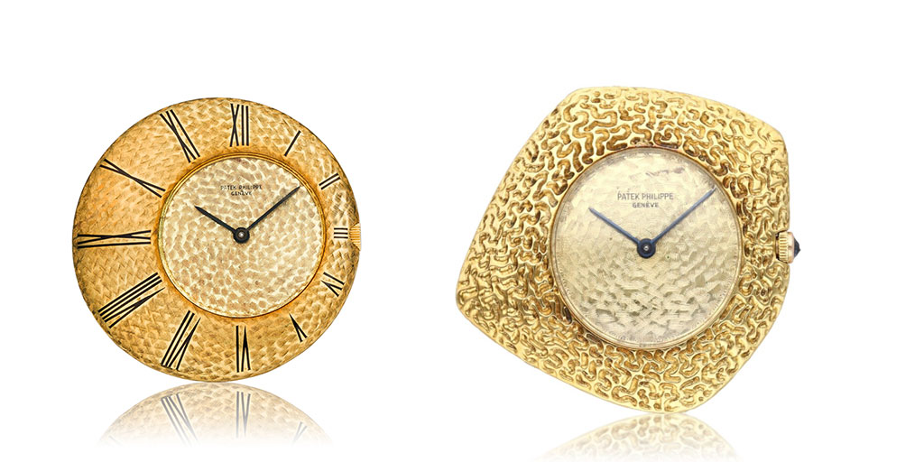 By the turn of the 1960s, Gilbert Albert was focusing on his true love, jewelry. Here his creativity knew no bounds, he would see beauty where no one else would. He reveled in using unusual materials such as meteorites and fossils, contrasting these rough materials with highly polished or textured gold, with a sprinkling of more traditional gemstones such as rubies, emeralds and diamonds. As always, he drew inspiration from nature: he would see a shell and see something precious to be replicated in a watch. He would see textures and lines in a meteorite and treat them in the same way as a precious stone. He even used fur to create straps. Such inspiration fueled an extraordinary array of jeweled watches and pendants, and traditional pieces of jewelry such as necklaces, bracelets and rings. To learn more about Gilbert Albert’s extraordinary catalog of shaped timepieces for Patek Philippe, read this Collectability article.